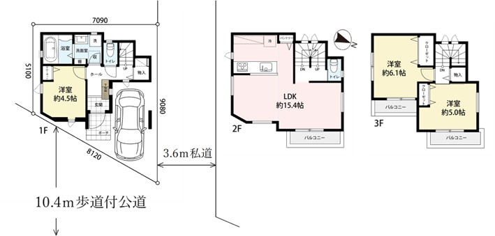 | 間取内容 | LDK15.4帖 2階 1室洋室4.5帖 1階 1室洋室6.1帖 3階 1室洋室5.0帖 3階 1室 ※建物面積には車庫面積(8.10㎡)を含みます |